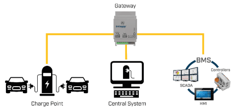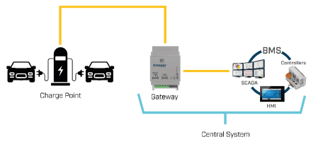 Med Intesis INMBSOCP0010100 (1 lader) og INMBSOCP0200100 (20 ladere) kan dine EV-ladere kommunisere med Modbus TCP/RTU systemer og/eller med OCPP backend, også skybasert.